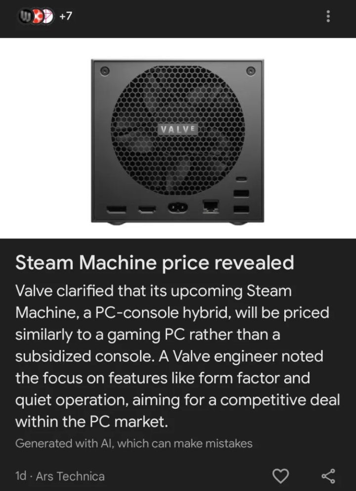 IT之家注意到,其中一个例子是“SteamMachine价格公布”,但实际上根本没公布。Valve公司明确表示要到明年才会公布价格。ArsTechnica原来的标题要严谨得多:“Valve的SteamMachine外形像游戏主机,但别指望它的定价也如此亲民。”